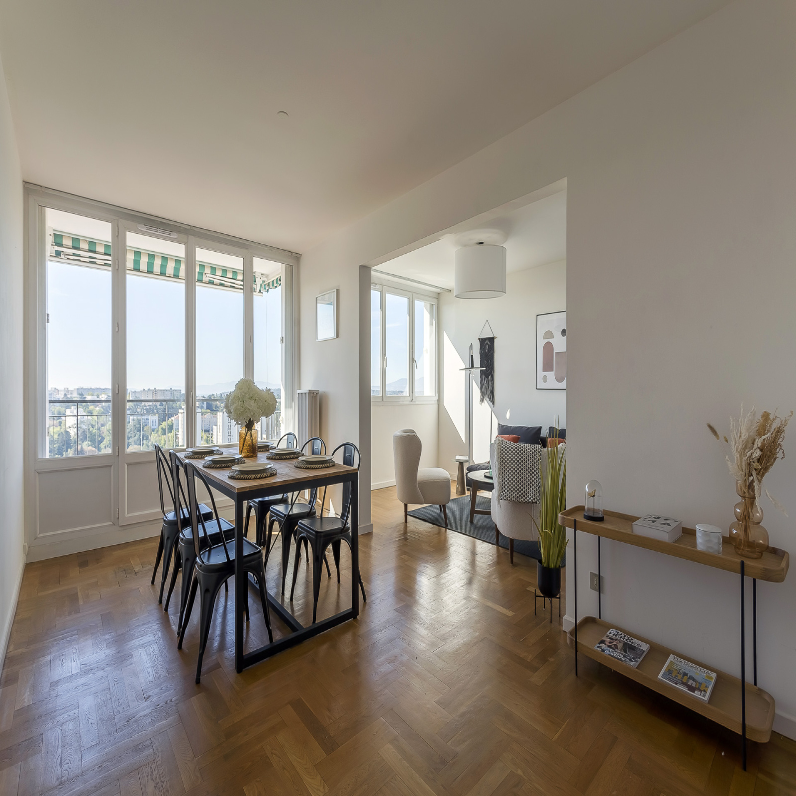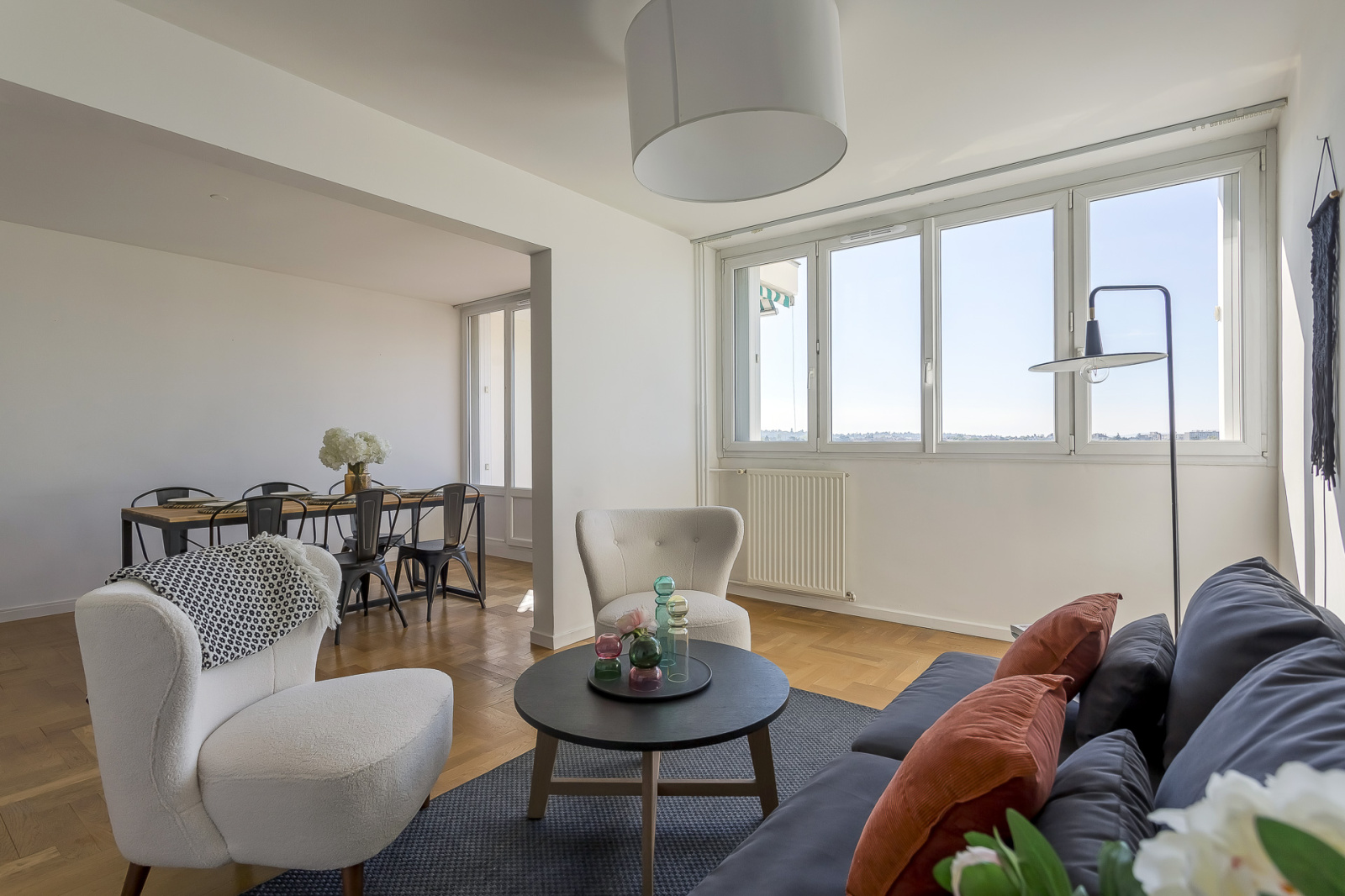 Venez découvrir au 6ème et avant-dernier étage avec ascenseur, ce grand T3 traversant de 88,17m2 composé d’une entrée avec placard, une cuisine équipée, un séjour double de 30,26m2 baigné de lumière, parquet en chêne massif (poss 3ème chambre) donnant sur un balcon, exposition sud, sans vis-à-vis, vue imprenable sur les Monts du Lyonnais, un dégagement desservant deux chambres avec vue dégagée sur les Monts d’Or, une salle de bain, wc séparé, de nombreux rangements.