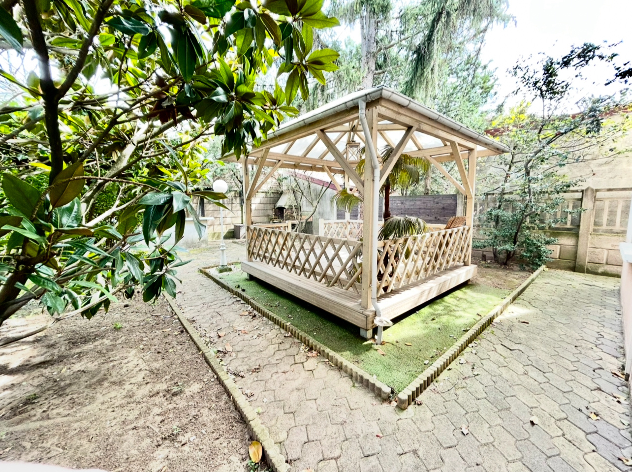 Jardin clos, arboré et sans vis-à-vis, idéal pour profiter des beaux jours avec un espace bar, barbecue, et un kiosque en bois.