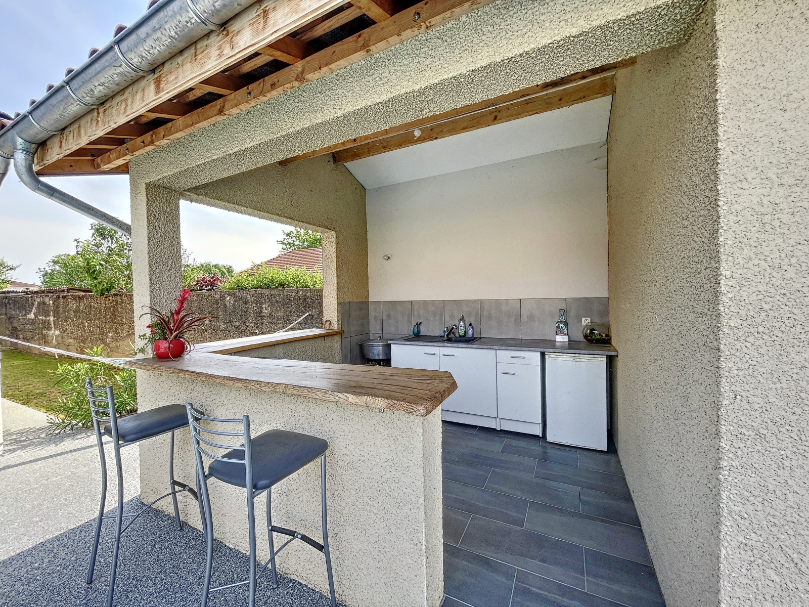 Cette maison dispose d'un jardin de 743m2 clos et arboré avec une terrasse couverte , une piscine, une cuisine d'été, un four à pizzas avec barbecue.