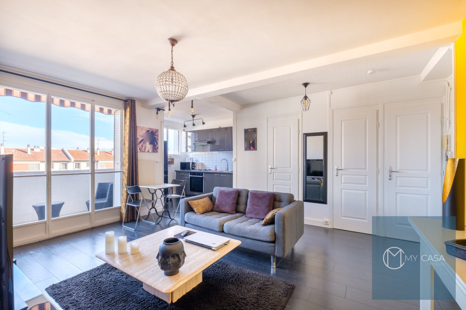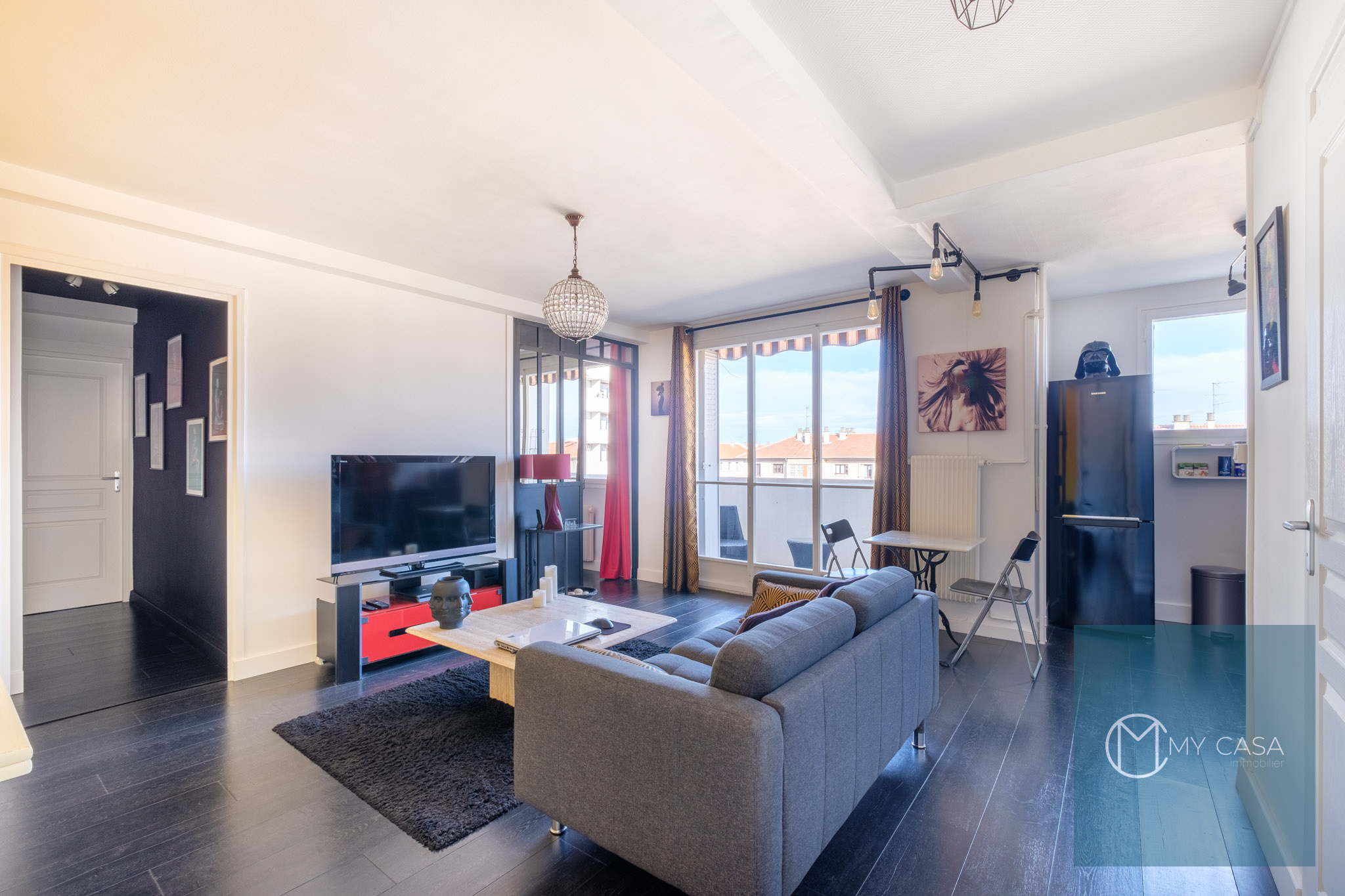 EXCLUSIVITE - Bastien STERCKEMAN vous propose à 5 min à pied du métro Gratte-Ciel, à proximité immédiate des écoles et des commerces. Au 6ème étage, avec ascenseur, d'une copropriété bien entretenue avec gardien, ce superbe T2 bis rénové en 2020 composé d'une cuisine équipée et ouverte sur le séjour lumineux avec parquet pour une pièce de vie de 25 m2 donnant accès à un balcon de 8 m2 exposé Est sur le parc de la copropriété, sans vis à vis direct. Profitez de 2 chambres agréables (11 et 9 m2) au calme avec accès au balcon ainsi qu'une salle d'eau fonctionnelle et WC séparé. Rénovation de bon goût et récente. Etage élevé. Lumineux et très calme. Vendu libre de toute occupation avec une cave et parkings extérieurs communs sécurisés par le portail de la copropriété. A voir sans tarder !